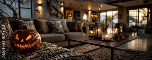 © Georgii, Obraz premium Cozy living room scene with pumpkin jack-o-lanterns, candles and warm autumn lighting