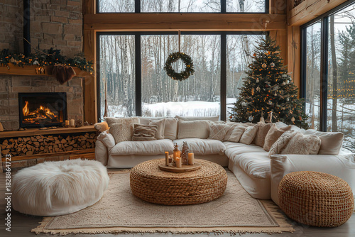 Naklejka premium Cozy living room with a Christmas tree, fireplace, and snowy winter view,...
