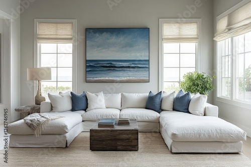 © ChaoticMind, Fototapeta premium Cozy living room with a large sectional sofa and elegant ocean-themed artwork in natural light