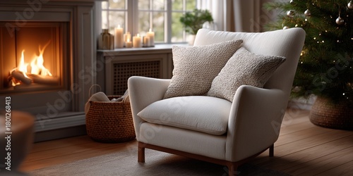 © Iryna, Fototapeta premium Cozy living room with armchair by fireplace and christmas tree