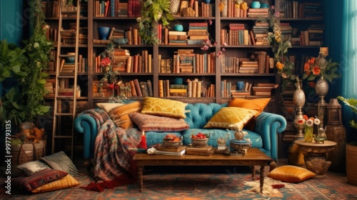Naklejka premium Cozy Living Room with Bookshelf and Vintage Decor