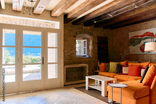 Obraz premium Cozy Living Room with Bright Orange Sofa Overlooking Scenic View Through Open Doors in a Stone-Finished Home