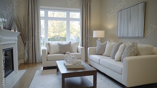 © Ssl, Obraz premium Cozy living room with fireplace and large window