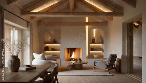 Fototapeta premium Cozy living room with fireplace and modern furniture interior design