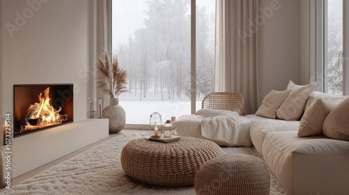 Obraz premium Cozy Living Room with Fireplace, Plush Sofa, and Snowy View