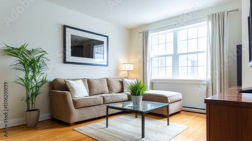 Fototapeta premium Cozy Living Room with Modern Decor and Natural Light Streaming In