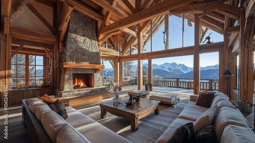 Fototapeta premium Cozy Living Room with Mountain View and Fireplace