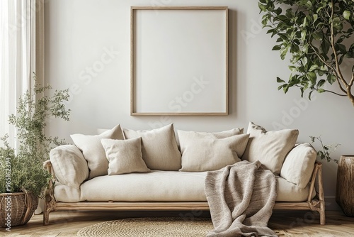 © AdibaZR, Naklejka premium Cozy living room with neutral tones and greenery.