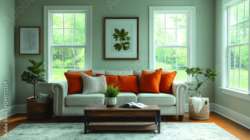 © suparti, Fototapeta premium Cozy Living Room with Orange Accents