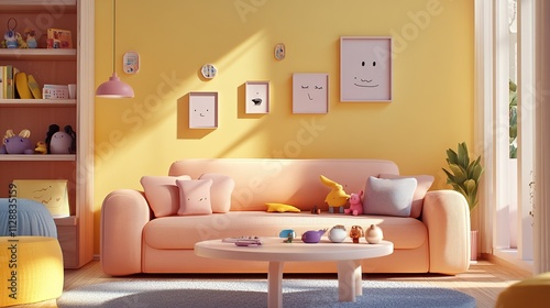 © Garin, Obraz premium Cozy living room with playful decor and cheerful artwork.