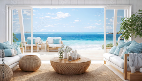 © Hoody Baba, Naklejka premium Cozy living room with sea view. 3d rendering mock up