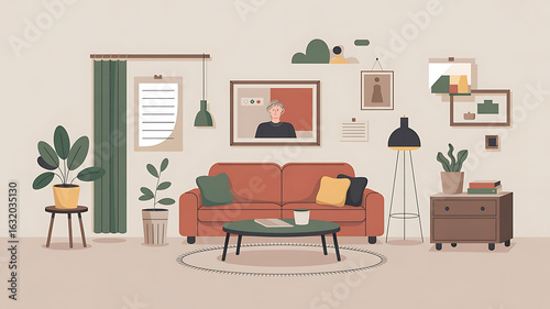 © karmpolista, Fototapeta premium Cozy living room with terracotta sofa, plants, and art.