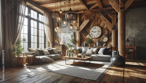 Fototapeta premium Cozy living room with wooden accents and natural elements, Cozy Living Room...
