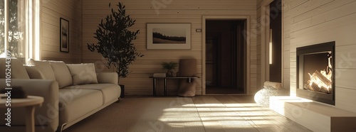 © adinuranjaya, Obraz premium Cozy Living Room with Wooden Interior and Fireplace