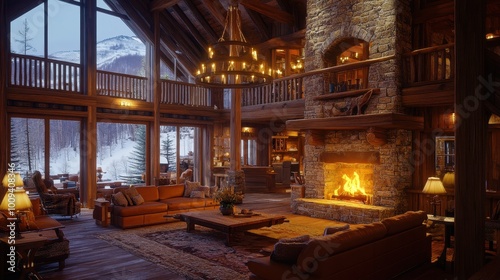 © JH45, Fototapeta premium Cozy Log Cabin Getaway in the Mountains with Fireplace