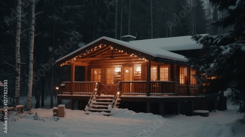 © Atmospheric stock, Obraz premium Cozy log cabin in snowy forest with warm lights at night