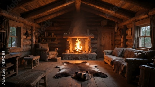 Fototapeta premium Cozy Log Cabin Interior with Fireplace and Rustic Furniture