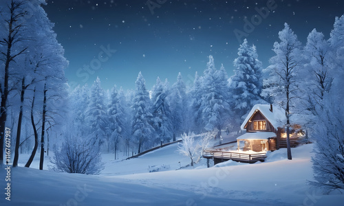 © samsulalam, Fototapeta premium Cozy log cabin nestled in snow covered forest at night during a snowfall