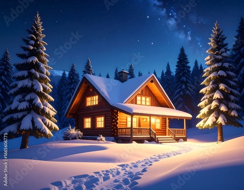 Fototapeta premium Cozy log cabin nestled in snowy forest at night