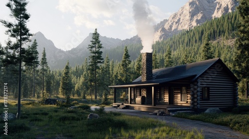 © Alzo, Fototapeta premium Cozy log cabin surrounded by mountains and trees, with smoke rising.