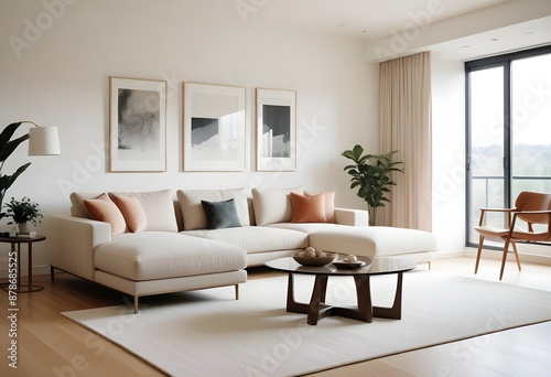 © Pixel Focus AI, Fototapeta premium Cozy minimal modern living room interior design, with a dining room including a sofa, chairs, empty living room with beige walls
