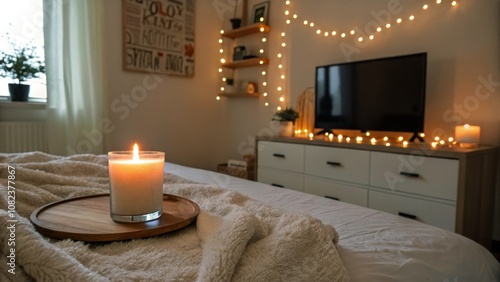 Fototapeta premium Cozy Minimalist Bedroom with Candle, Fluffy Blanket, and String Lights for Relaxation and Comfort