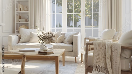 Fototapeta premium cozy, minimalist living room featuring soft, neutral colors and clean lines