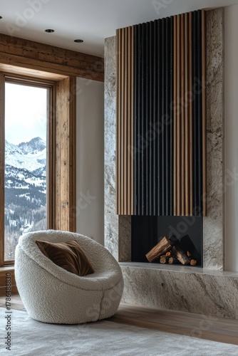 © Georgii, Naklejka premium Cozy minimalist living room interior with modern fireplace and plush chair in rustic mountain setting
