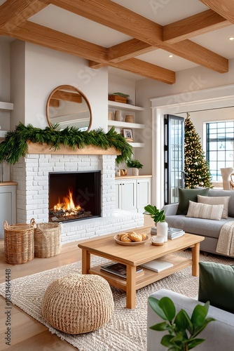 Obraz premium Cozy modern living room with fireplace, Christmas tree, greenery garland, and warm natural decor