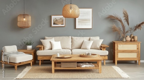 Fototapeta premium Cozy Modern Living Room with Neutral Tones and Natural Decor