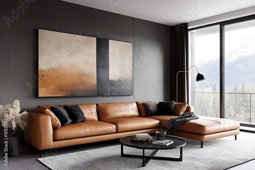 Fototapeta premium Cozy Modern Living Room with Neutral Tones, Stylish Decor, and Elegant...