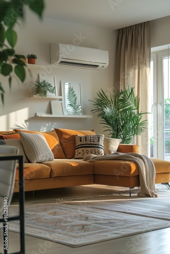 Fototapeta premium Cozy Modern Living Room with Orange Sofa, Indoor Plants, and Natural Light