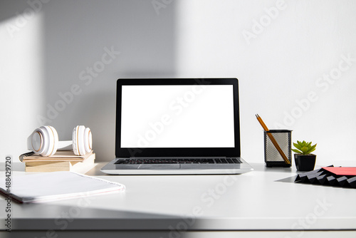 © Alex, Fototapeta premium Cozy modern workspace with computer and office supplies near the window.