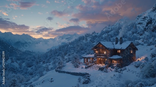 Fototapeta premium Cozy mountain cabin at sunset, snow covered landscape.