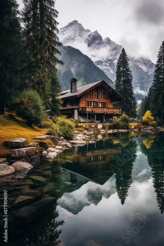 Fototapeta premium Cozy Mountain Cabin by a Serene Lake with Snowy Peaks