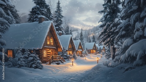© Anita, Naklejka premium Cozy mountain cabin glows under snowy twilight capturing cabin serenity, cabin atmosphere evokes warm holiday vibes and nostalgic flair for stock creators seeking scenic winter storytelling magic.