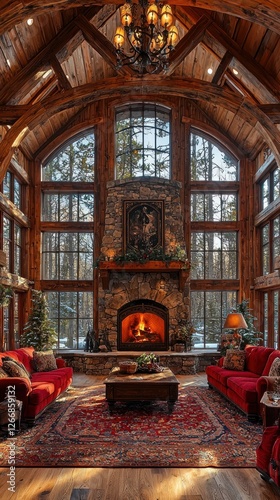 © mlangsen, Fototapeta premium Cozy mountain cabin living room with stone fireplace and forest view in winter