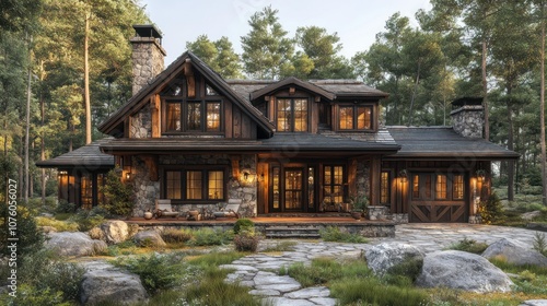 Obraz premium Cozy mountain cabin surrounded by trees and natural landscaping.