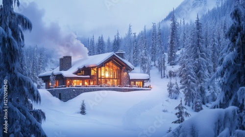Naklejka premium Cozy Mountain Lodge Covered in Snow with Warm Light Glow