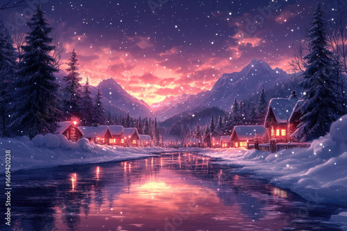 © Roman, Fototapeta premium Cozy Mountain Town Wrapped in Winter’s Christmas Embrace