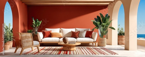 Obraz premium Cozy outdoor living room with arches, red wall, and sea view on a sunny terrace