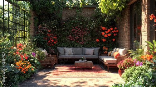 Obraz premium Cozy outdoor seating area surrounded by vibrant flowers.