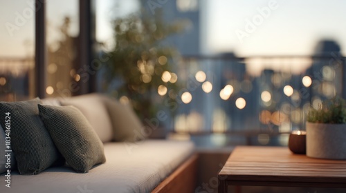 © CYBERPINK, Naklejka premium Cozy outdoor seating area with a view of the city skyline. the seating area is furnished with a beige sofa and two gray throw pillows.