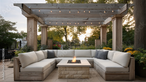 Obraz premium Cozy outdoor seating area with beige cushion sofa, wooden pergola, string lights, fire pit, and lush garden surroundings