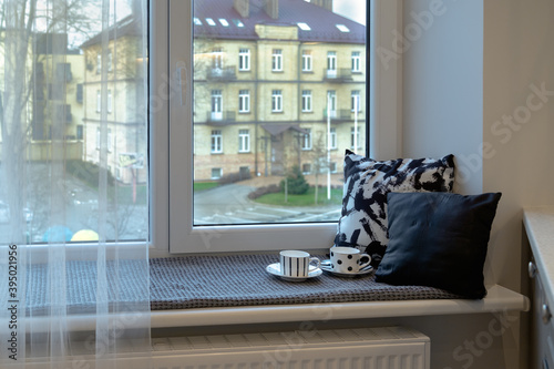 Obraz premium Cozy part of the kitchen in an old residential house with a view of the city through the window. The windowsill covered with a gray fabric overlay, on it two black-white pillows and cups of coffee