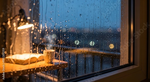 Obraz premium Cozy rainy evening indoors, reading book with warm lamp light and coffee by the window