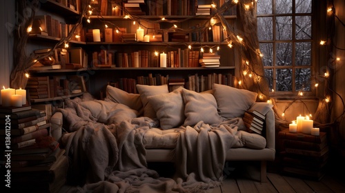 © Mohsin, Naklejka premium Cozy reading corner soft warm lighting floating bookshelf stacked beautifully arranged book comfy armchair knitted blanket glowing fairy light wooden flooring rustic aesthetic ultra HD detailed cozy