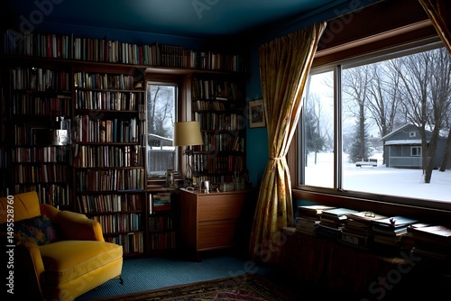 Naklejka premium Cozy reading nook, warm room with a window view, bookshelves filled with...