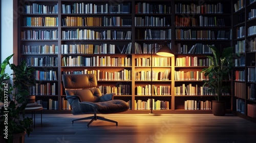 Fototapeta premium Cozy Reading Nook With Warm Lighting in a Modern Library Filled With Books, Perfect for Quiet Study and Relaxation at Any Time of the Day