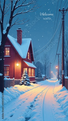 Obraz premium Cozy red cottage on snowy night with streetlamps illuminating a frosty path...